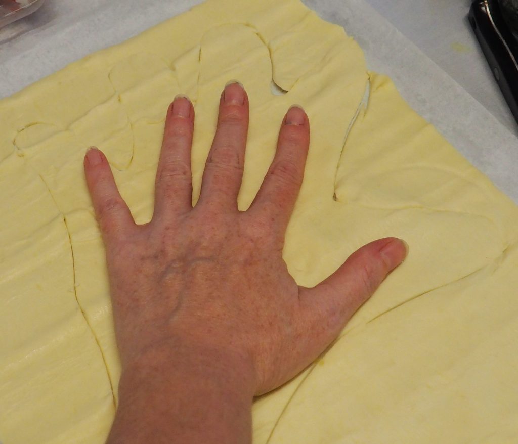 Extiende el hojaldre, coloca encima tu mano (o si prefieres dibuja una en papel de horno) y corta con un cuchillo o con una rueda para pizza. Haz lo mismo con el segundo hojaldre.