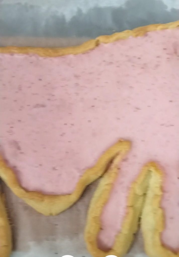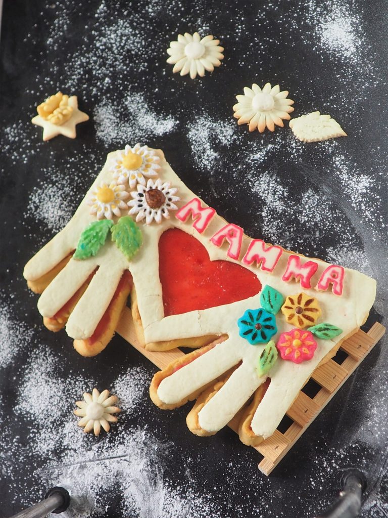 Sacad la masa de la nevera, extendidla sobre una hoja de papel de horno con un rodillo a una altura de aproximadamente dos centímetros, poned encima las manos recortadas en el papel de horno y con un cuchillo bien afilado recortad a lo largo de los bordes. No cortéis el corazón en medio, ya que esta será la base de vuestra tarta. Metedla en el congelador durante aproximadamente media hora, colocando la forma con el papel de horno sobre una tabla de cocina.