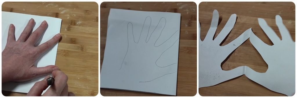 Tomad una hoja de papel de horno, colocad encima la forma de las manos recortada con el papel, dibujad el contorno de las manos en el papel de horno y recortadlo con unas tijeras.