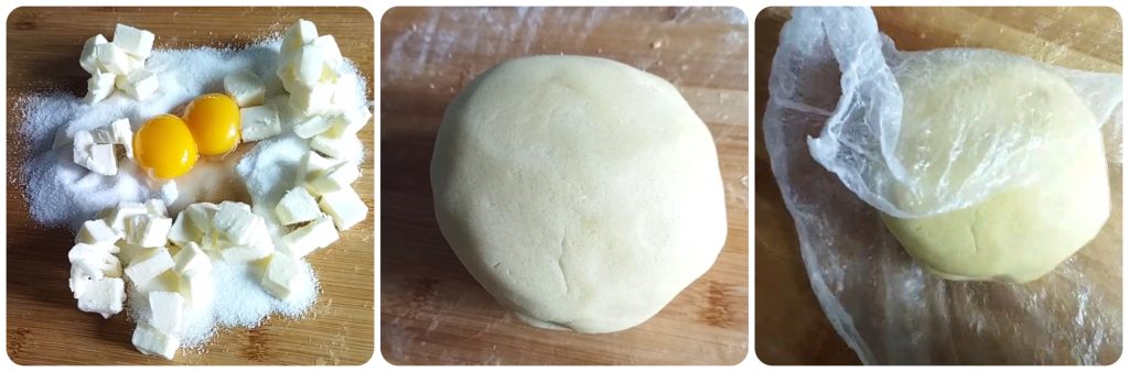 Poned sobre una superficie de trabajo todos los ingredientes, empezad a amasar y luego añadid la harina. Amasad todos los ingredientes, no demasiado, debe trabajarse rápidamente. Envolvedla en film transparente y metedla en la nevera durante aproximadamente media hora.