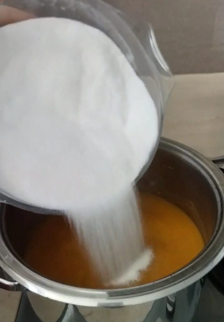 Seguid ahora las instrucciones en el paquete de Fruttapec 3:1, poned en un recipiente el azúcar y el Fruttapec 3:1 y mezcladlos bien con una cuchara. Verted todo en la cacerola con el puré de ciruelas.