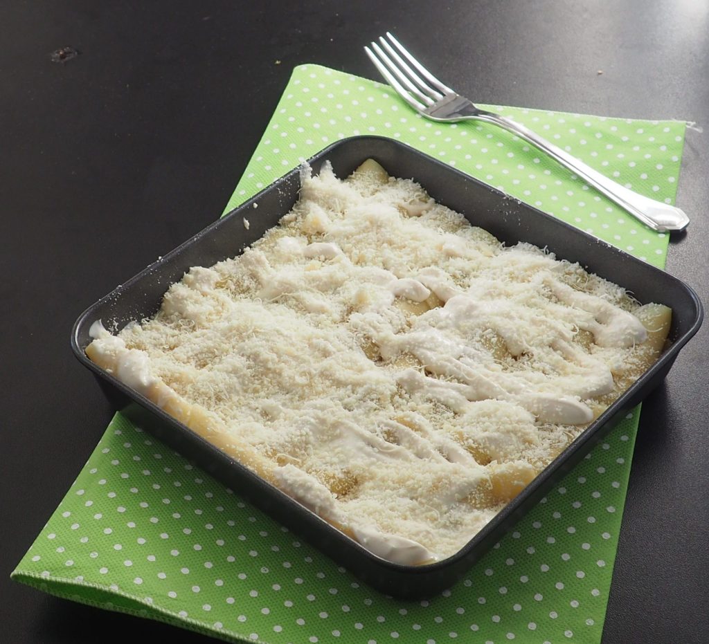 Encima coloca tus mini canelones, cubre con un poco de nata para cocinar y espolvorea con las dos cucharadas restantes de parmesano rallado.