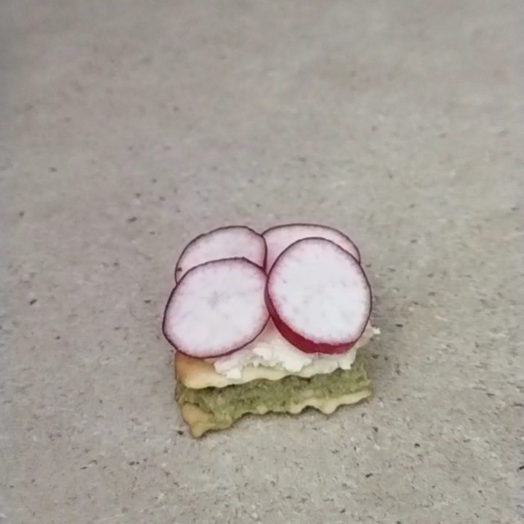 Corta en rodajas bastante finas tres rábanos, condiméntalos ligeramente con un poco de sal y un poco de aceite. Colócalos sobre la hoja con el queso formando los pétalos de una flor.