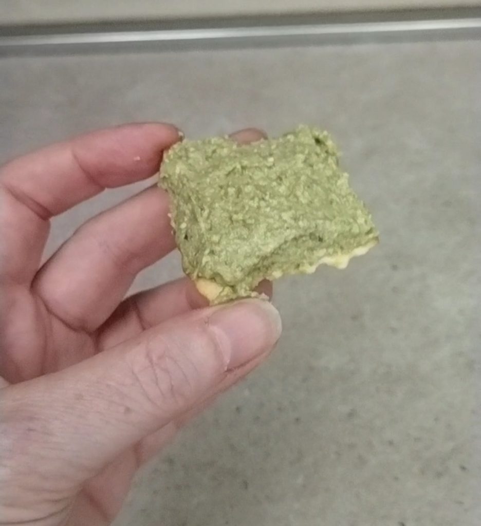 Unta una cucharadita aproximadamente de pesto (el que más te guste) en una hoja. Trata de nivelarlo bien y que no sobresalga por los bordes.