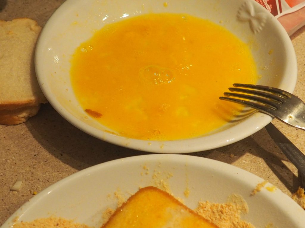 Pasad los sándwiches primero por el huevo batido, luego por el pan rallado, nuevamente por el huevo y el pan rallado, procurando presionar ligeramente el sándwich para que se compacte.