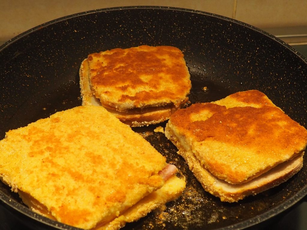 En una sartén, poned un poco de aceite, debe cubrir bien el fondo, freíd los sándwiches unos minutos por cada lado, hasta que estén dorados y crujientes.