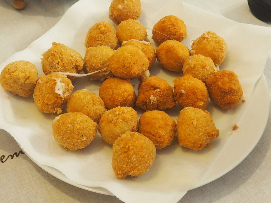 En una cacerola pon el aceite, cuando esté caliente, sumerge las bolitas de mozzarella y cocina a fuego medio hasta que estén doradas.