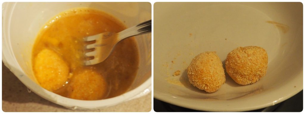 Ahora pásalas por los huevos y luego por el pan rallado.