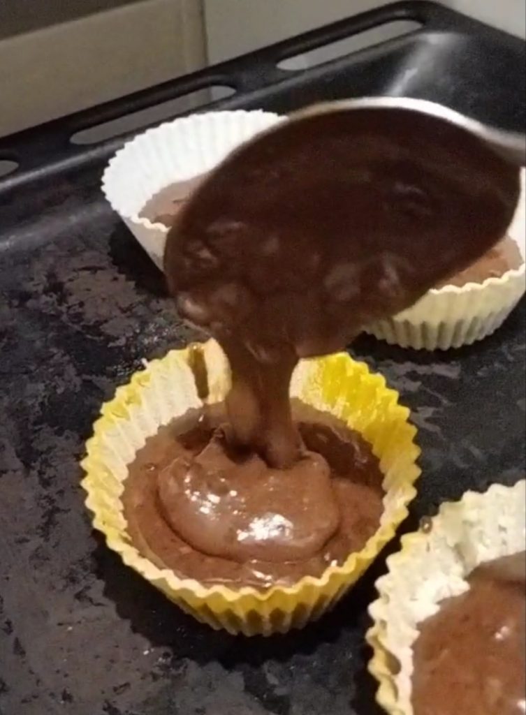 • Cubre todo con un poco más de mezcla de chocolate. No llenes demasiado los moldes, de lo contrario el muffin se saldrá durante la cocción. Obtendrás aproximadamente 12 moldes de diámetro 4,5 cm y aproximadamente 6 moldes de diámetro 6 cm.