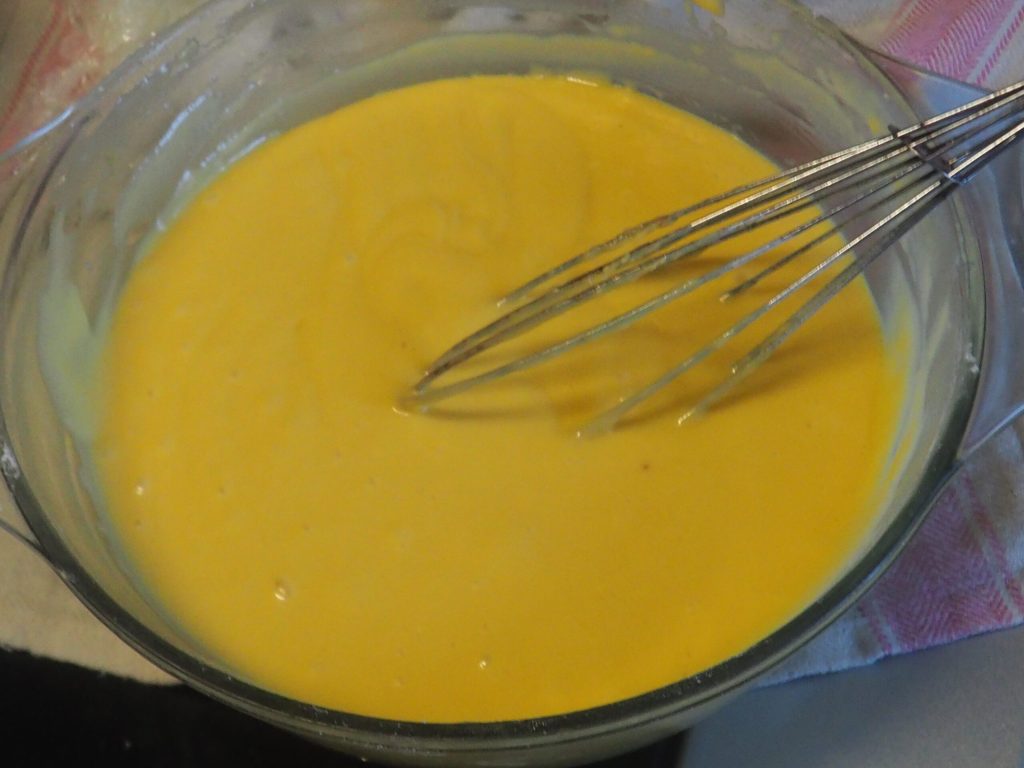 Tamiza la harina y la levadura, añádelas a la mezcla, mezclando con el batidor para incorporar aire.