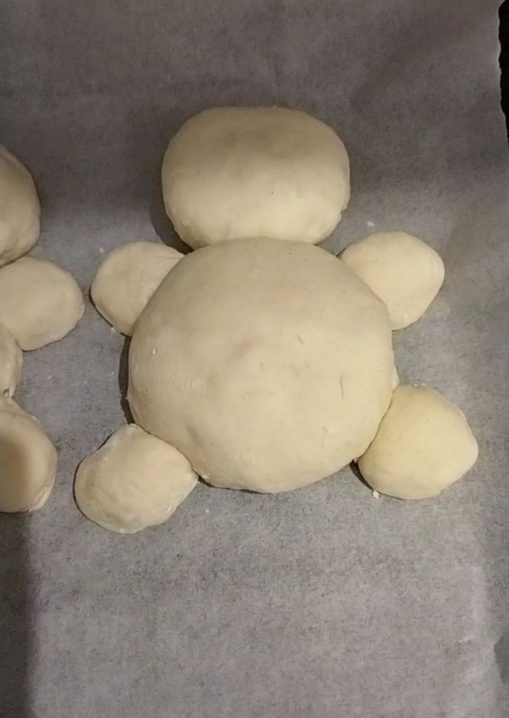 Una vez fermentada, formad las bolitas: 4 bolitas de 100 g (para el cuerpo), 4 bolitas de 60 g (para la cabeza), 16 bolitas de 10 g (para piernas y brazos).