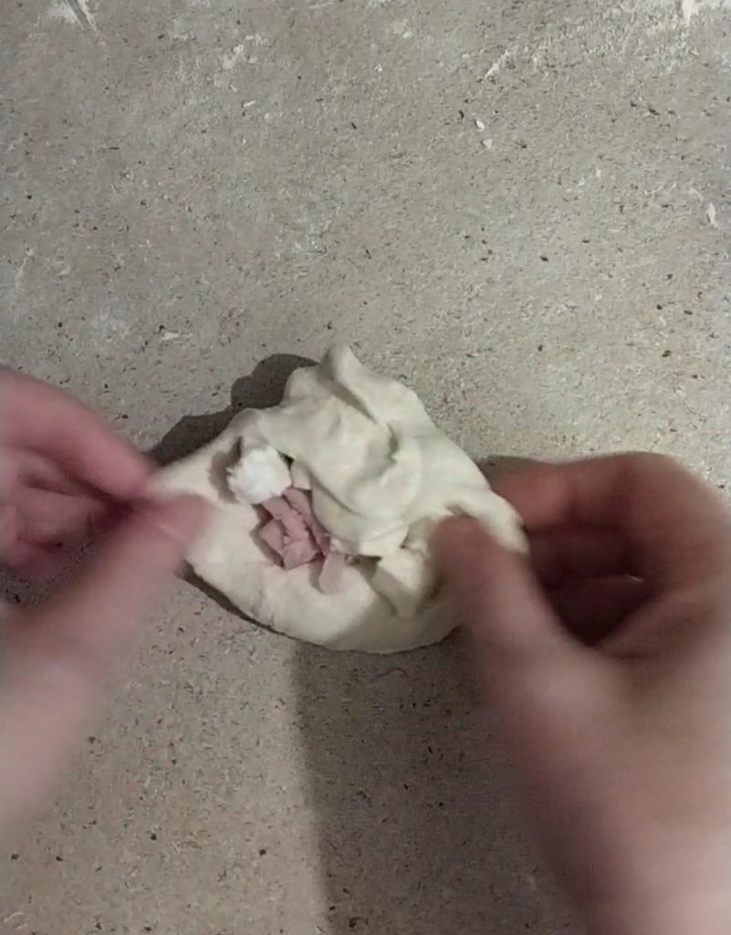 Rellenad las bolitas que usaréis para el cuerpo y la cabeza con el jamón cocido cortado en trozos y la mozzarella cortada en cubitos pequeños. En lugar de mozzarella también podéis usar queso emmental.