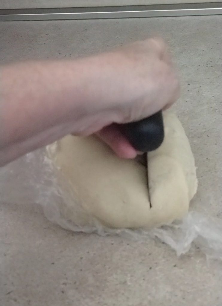Trabaja la masa durante unos minutos hasta obtener una bola lisa, elástica, seca y ligeramente suave. Envuélvela en papel film para evitar que se seque.
