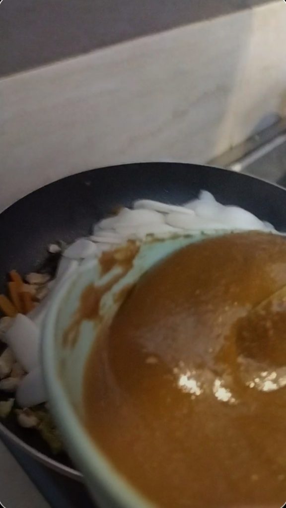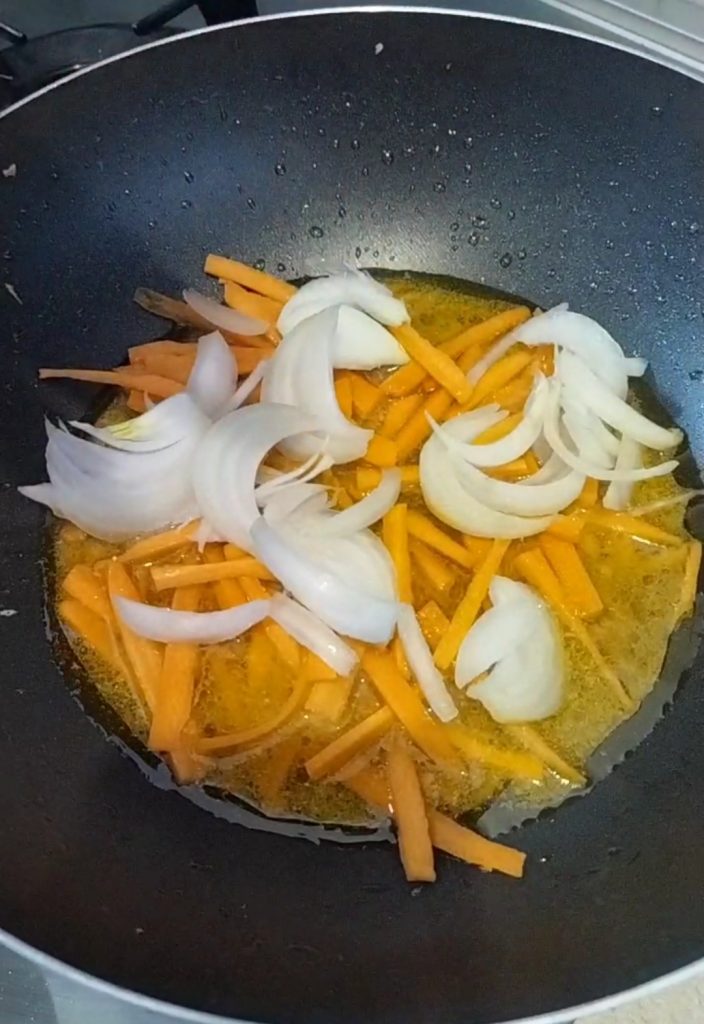 Pele la cebolla, lave y pele las zanahorias. En el wok donde previamente cocinaste la carne, cocina también las verduras. Primero poned la cebolla y las zanahorias cortadas en tiras, deben ablandarse ligeramente.
