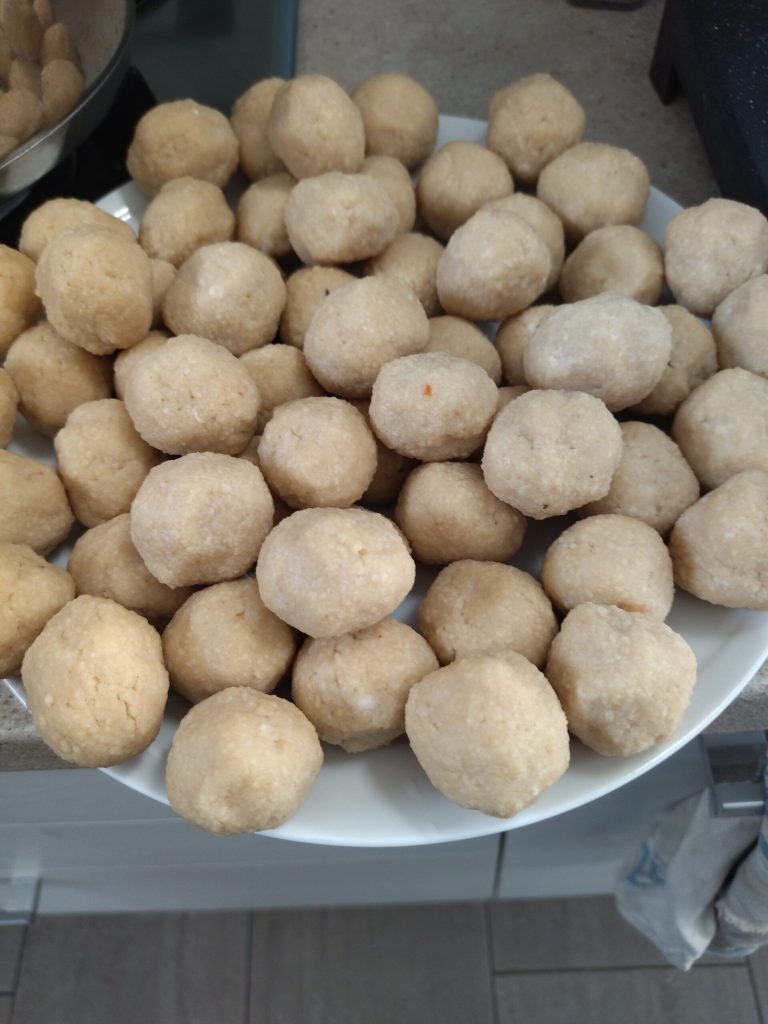 Ahora formad bolitas de aproximadamente 15 gr cada una, para trabajarlas mejor, humedece siempre ligeramente tus manos para humedecer el cuscús.