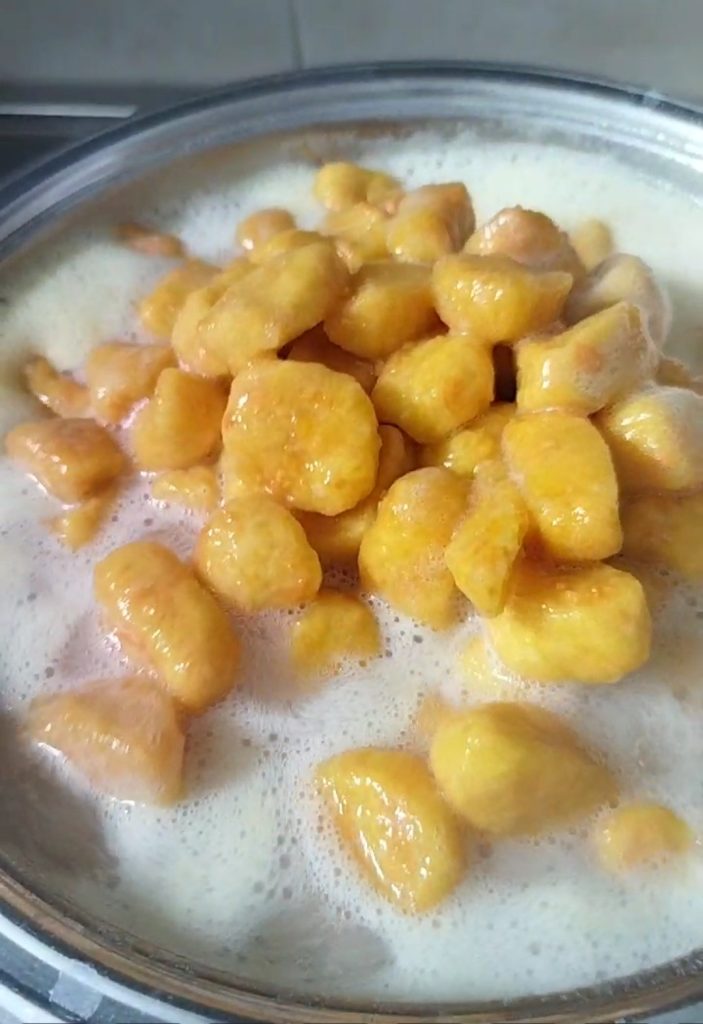 Llena una olla con abundante agua salada, cuando hierva, pon los ñoquis. Cuando suban a la superficie, espera unos segundos y luego escúrrelos.