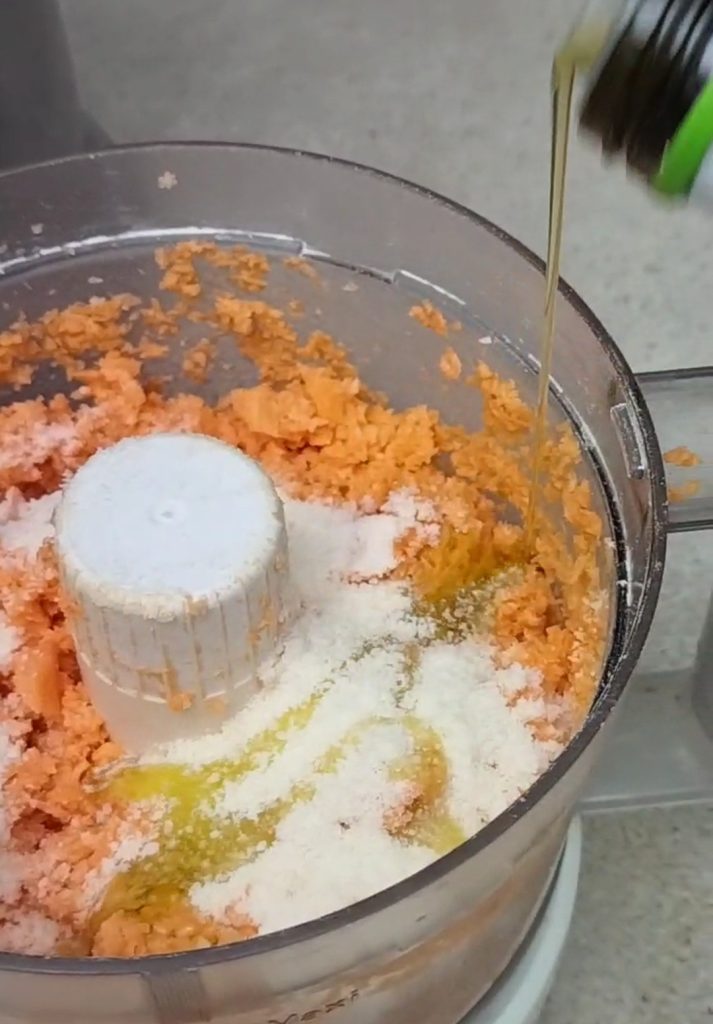 Comienza a triturar y luego añade el queso parmesano rallado y el aceite.
