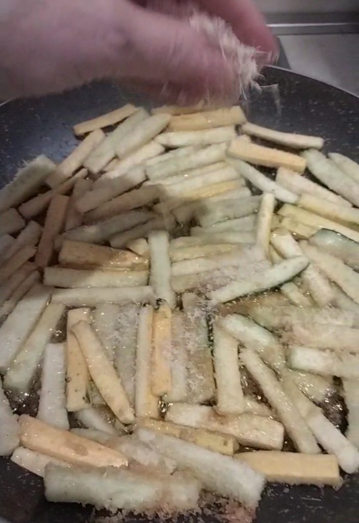 Cuando estén bien dorados y crujientes, dales la vuelta, espolvoréalos con otra cucharada de parmesano, una pizca de sal y cocínalos hasta que estén dorados. Si quieres, puedes añadir un poco de pimienta negra molida.