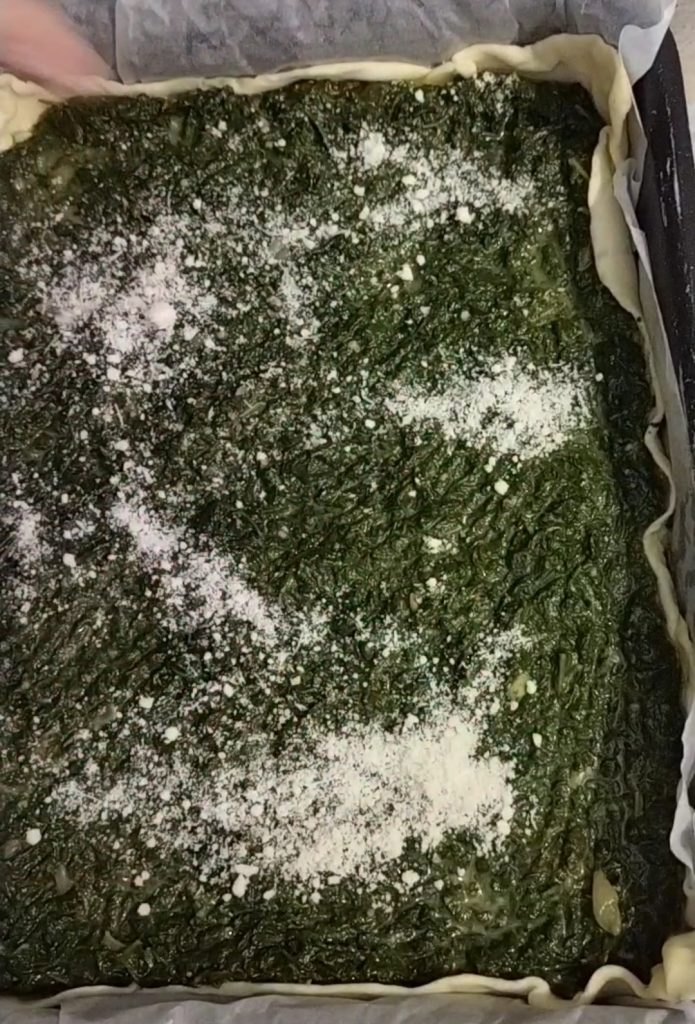 Cubrid con papel de horno una bandeja de dimensiones 31×23 cm, colocad encima el hojaldre. Verted en su interior la mezcla de espinacas.