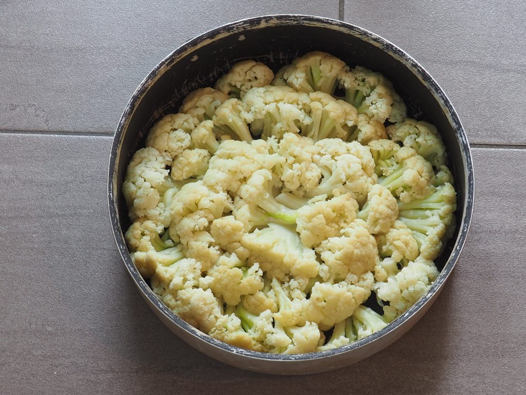 En este punto, coloca en un molde de 30 cm los coliflores como en la foto.Encima pon la salchicha en trocitos, añade una capa de puré de guisantes y cubre todo con trocitos de emmental cortado en lonchas.
