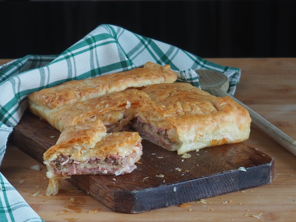 El pastel de hojaldre relleno de jamón, queso y carne picada es una delicia, una combinación de sabores que se complementan perfectamente entre sí. Se puede utilizar como segundo plato, pero también como plato único y os garantizo que no quedará ni un pedacito!