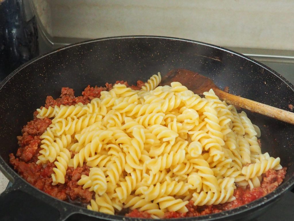 • Da una mezcla rápida, añade un poco de agua de cocción de la pasta.