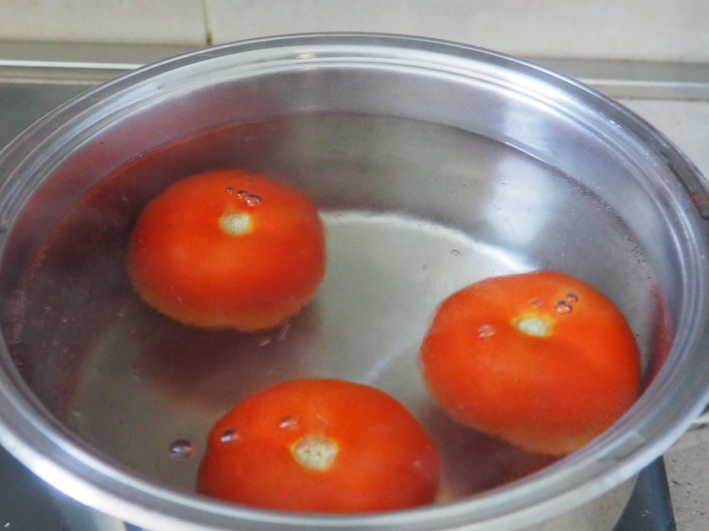 • En una olla, pon abundante agua, cuando hierva, sumerge los tomates previamente lavados y cocínalos durante aproximadamente un minuto.