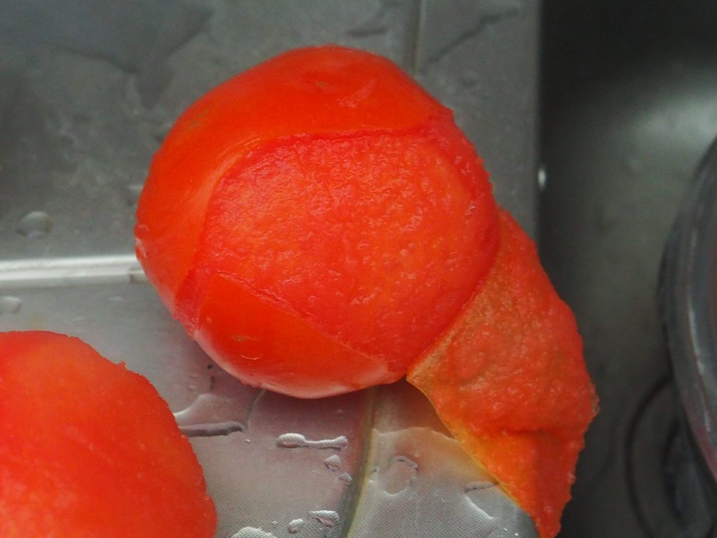 • Sácalos del agua con una espumadera, déjalos enfriar ligeramente y quítales la piel.
