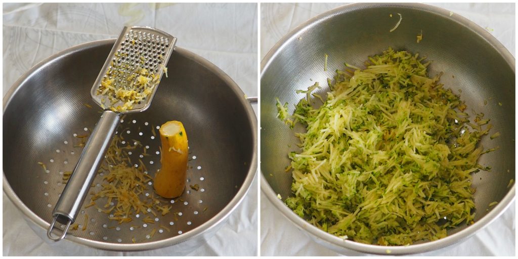 • Lavad y limpiad los calabacines, ralladlos (yo uso el rallador que uso para la piel de los limones) y ponedlos en un escurridor. Espolvoreadlos con una pizca de sal y dejad que suelten agua durante unos minutos.