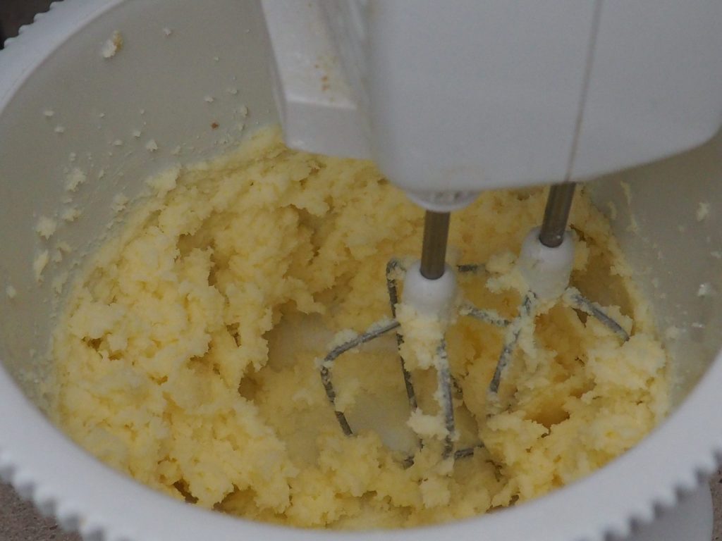 • En un mezclador pon la mantequilla troceada, añade el azúcar y mezcla hasta que estén bien integrados.