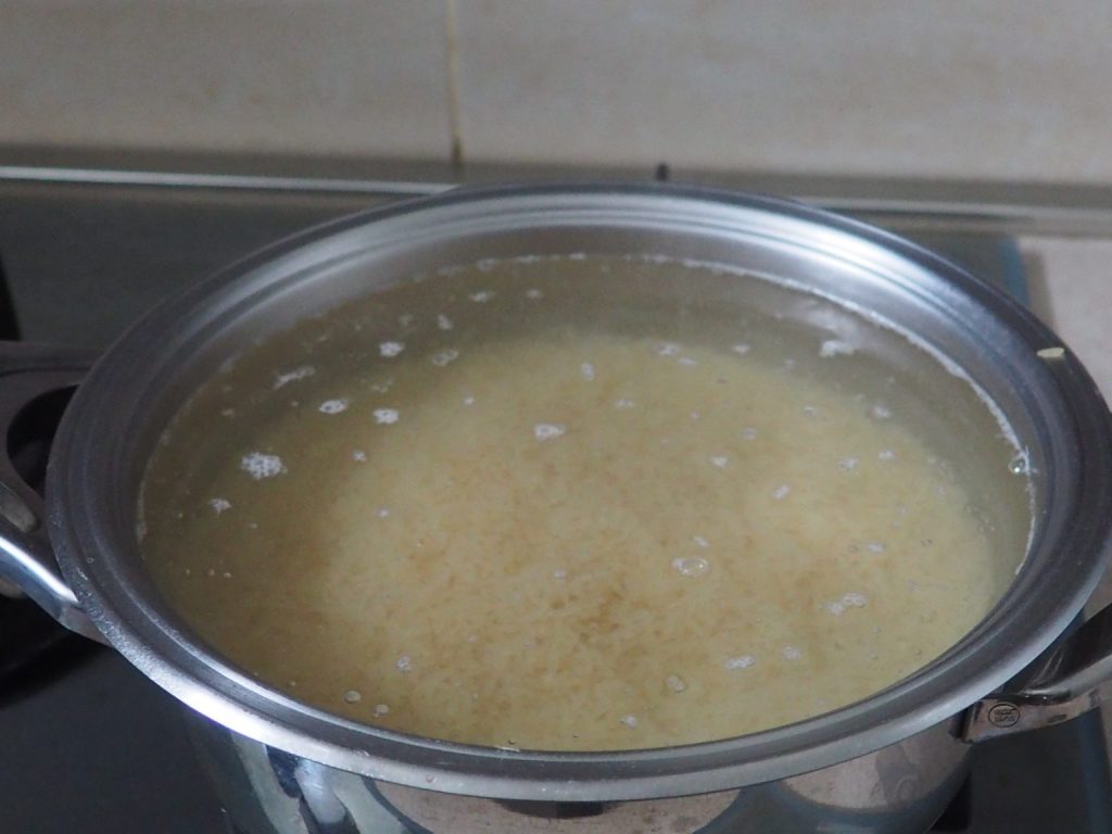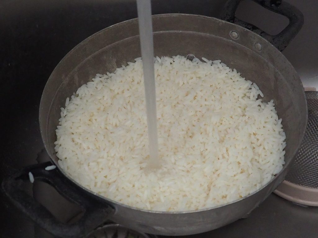 Una vez cocido, escurrid el arroz con un colador, enfriándolo con agua fría.