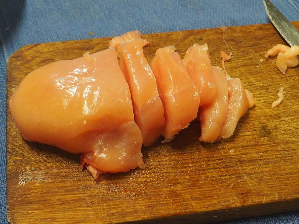 Corta la pechuga de pollo en dados de aproximadamente 1-1,5 cm.