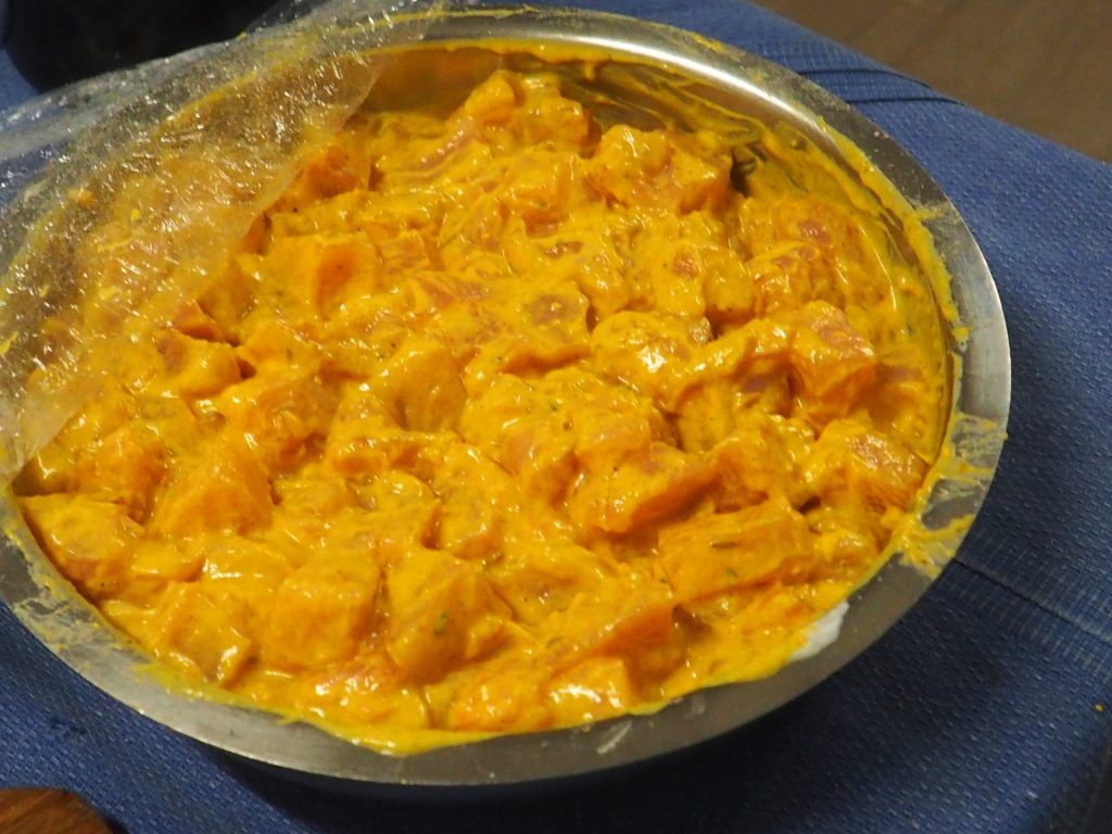 Ahora coloca el pollo en dados en la salsa de yogur, mézclalo para que quede completamente cubierto, cubre el recipiente con film transparente y deja marinar al menos una hora en el frigorífico. Si no tienes tiempo, puedes dejarlo solo un cuarto de hora, la carne se impregnará un poco menos, pero seguirá siendo sabrosa.