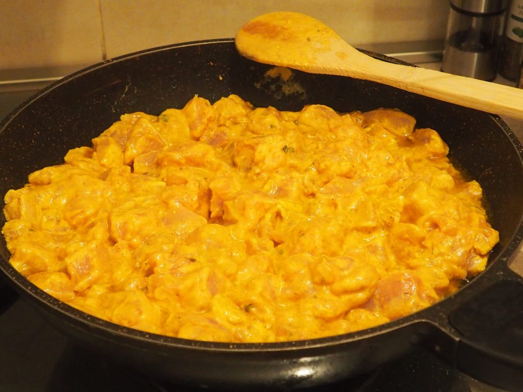 En una sartén grande, pon tres cucharadas de aceite de oliva, el ajo, la cebolla y la guindilla. Sofríe ligeramente y añade el pollo marinado. Cocina a fuego medio durante unos 30 minutos, removiendo de vez en cuando.
