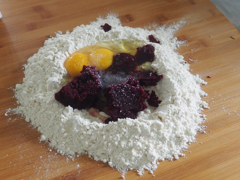 En una superficie de trabajo, coloca la harina en forma de volcán, añade los huevos, el puré de remolacha, la sal.