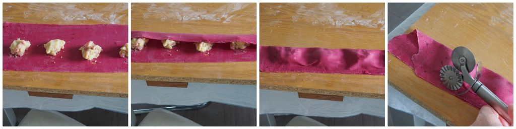 Me encanta la pasta hecha en casa y me gusta enriquecerla con un poco de color. Prueba estos ravioles de remolacha rellenos de patatas y panceta, son realmente sabrosos y al mismo tiempo delicados. Si quieres un color más intenso te recomiendo cocinar la remolacha en el horno. Aquí encuentras una idea de cómo condimentarlos
