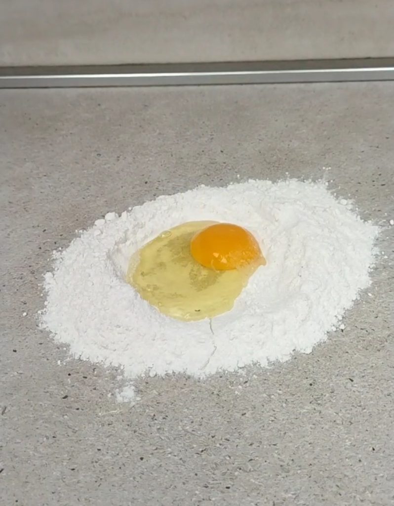 Colocad la harina en forma de volcán sobre una superficie de trabajo, añadid el huevo y la sal. Amasad enérgicamente durante unos 15 minutos.