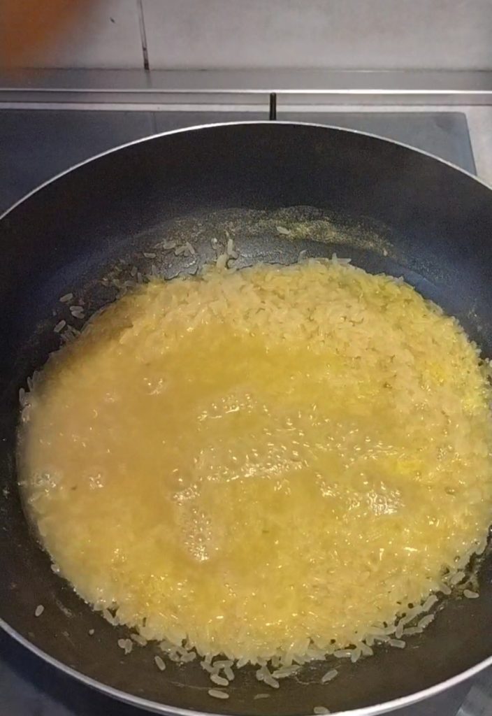 En un wok tuesta el arroz y añade el zumo de los cítricos.