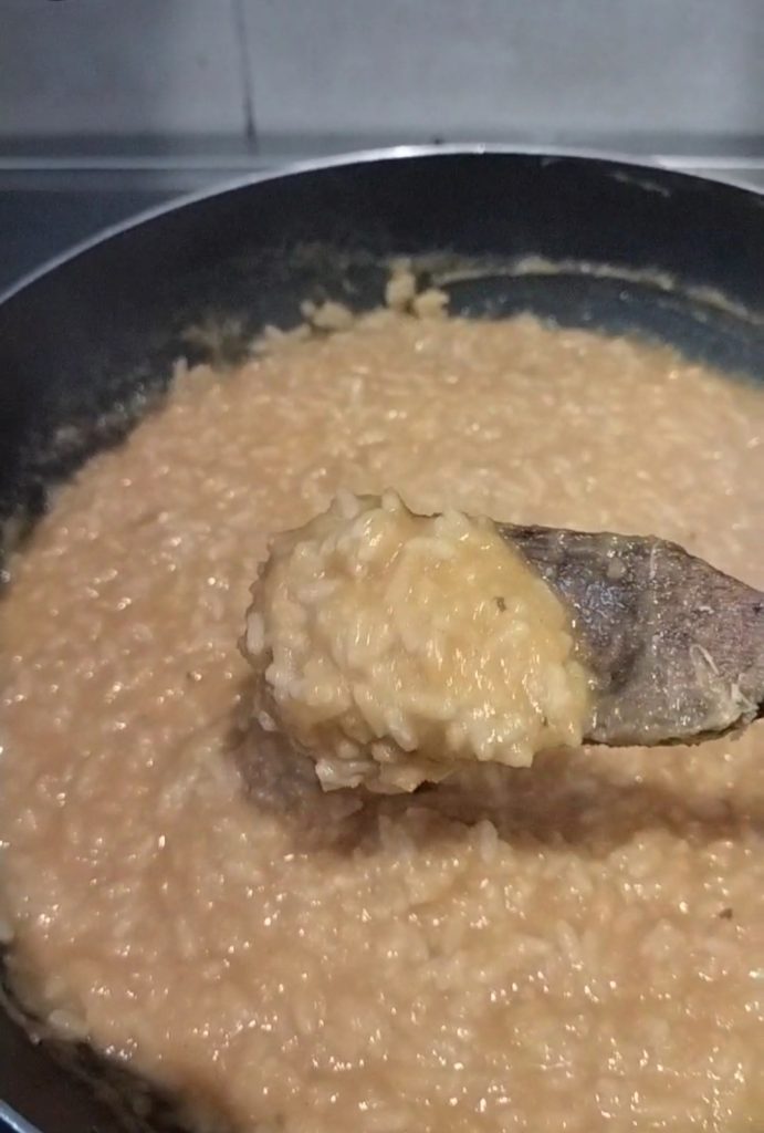 Remueve de vez en cuando y a medida que se seca, agrega el caldo poco a poco.