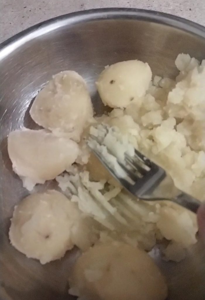 En una olla pon la mitad de agua, en cuanto hierva añade la sal gruesa y las patatas previamente lavadas y cortadas por la mitad. Cuécelas durante unos 15 minutos, hasta que estén tiernas. Ahora escúrrelas, quita la piel y ponlas en un bol. Aplástalas con un tenedor, hasta convertirlas en un puré grueso.