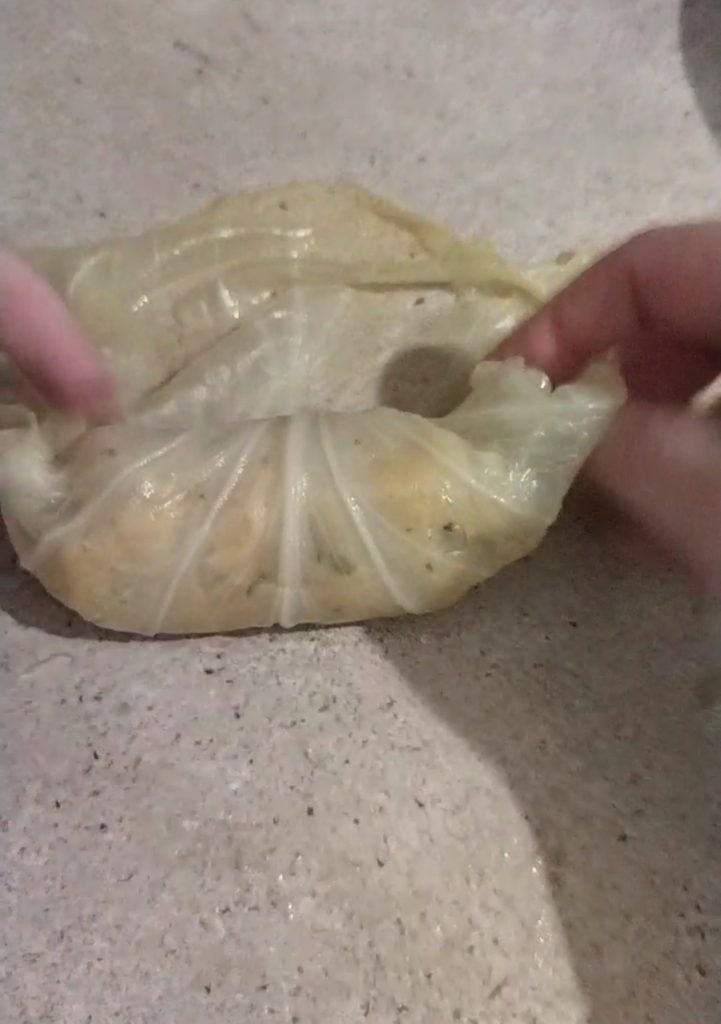 Ahora toma una hoja de col y rellénala con una buena cucharada de relleno.