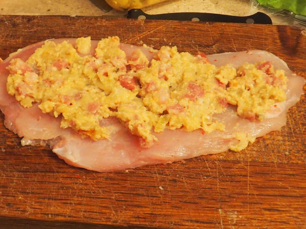 Coloca las rodajas de pollo sobre una superficie, si son demasiado gruesas, envuélvelas en papel film y golpéalas con un mazo. Extiende una buena cucharada del relleno sobre la superficie.
