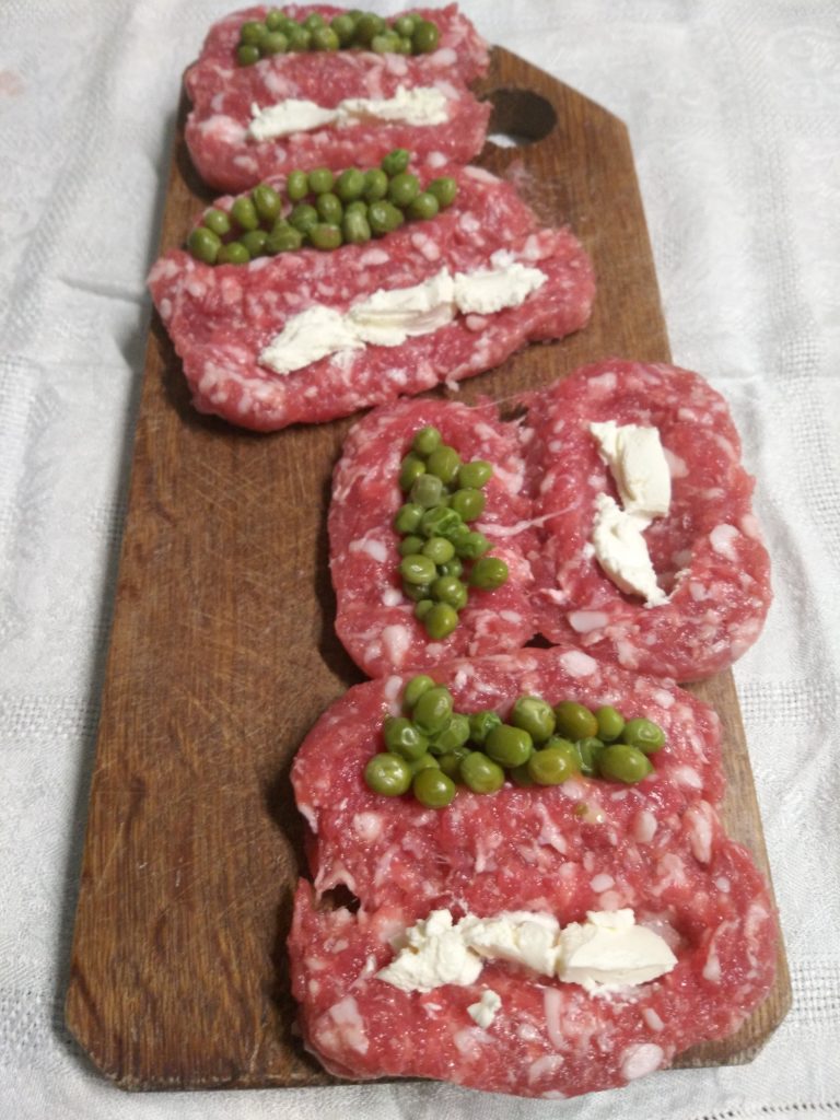 Golpear los filetes de pollo con un mazo para carne después de haberlos protegido con papel film, extenderlos sobre una superficie y poner encima dos cucharaditas de guisantes y dos de queso para untar. Enrollar bien, y si es necesario cerrar con un palillo.