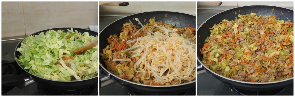 En este punto, añade el repollo, que al principio tendrá mucho volumen, pero en poco tiempo se marchitará y se mezclará bien con el resto de la mezcla. Luego añade los brotes de soja.