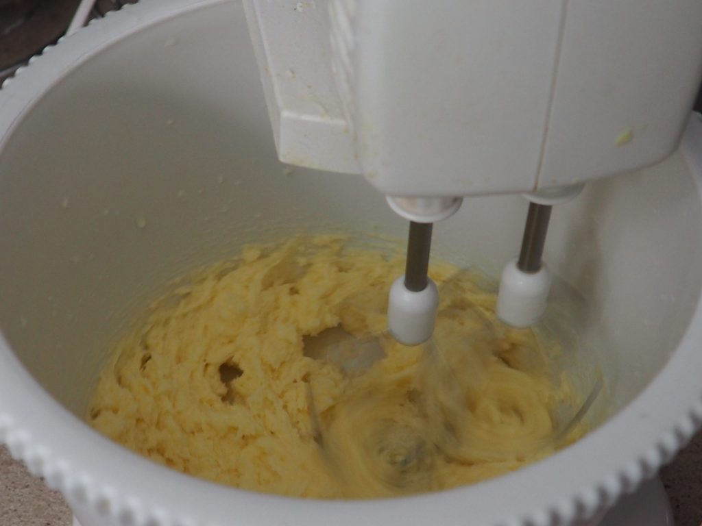• En una batidora, coloca la mantequilla cortada en trozos con el azúcar y mezcla hasta que estén bien amalgamados.