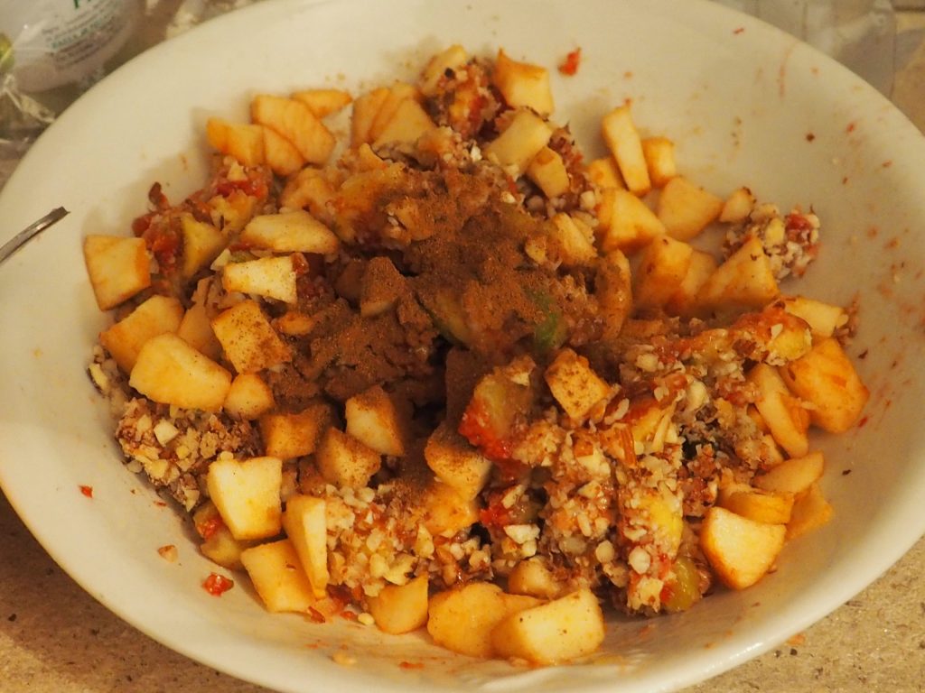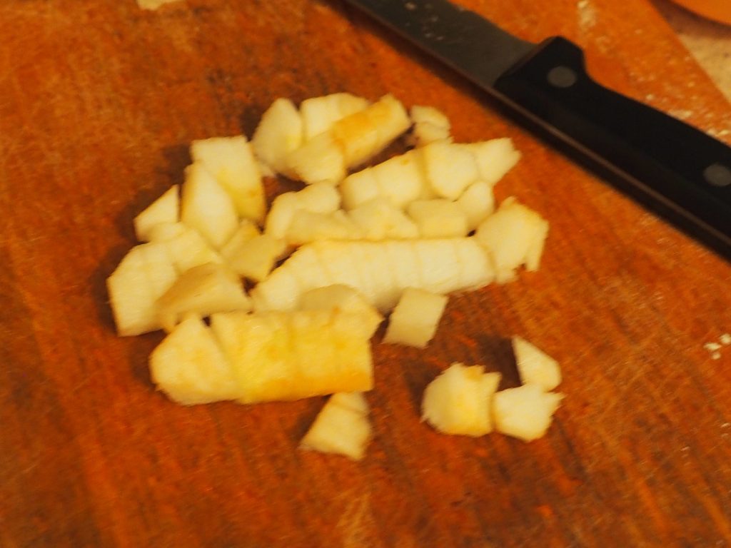 • Pela, quita el corazón a las manzanas y córtalas en dados bastante pequeños.