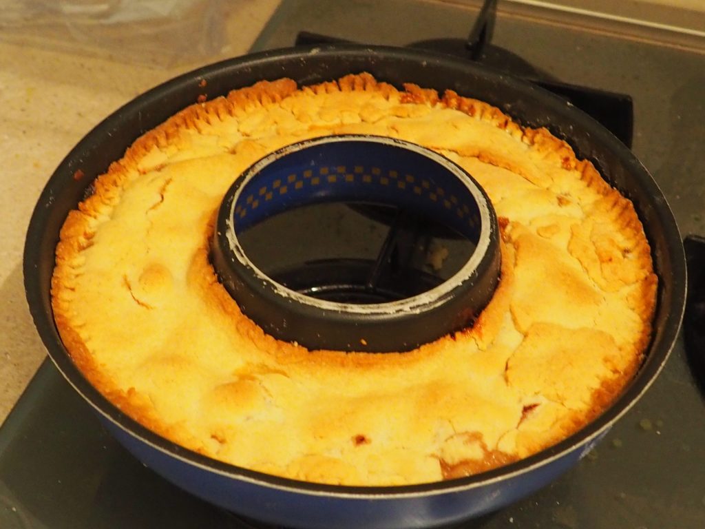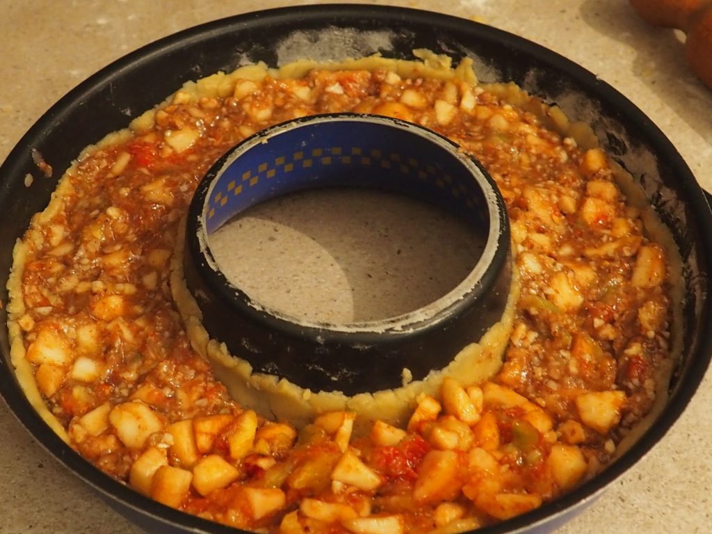 Rosca de masa quebrada rellena de higos, manzanas y almendras