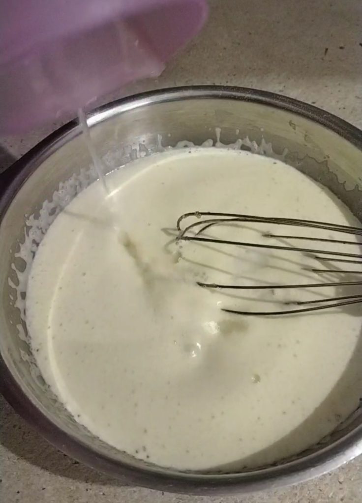 • Añade la leche, el agua donde habrás disuelto la magnesia efervescente y mezcla bien con un batidor.