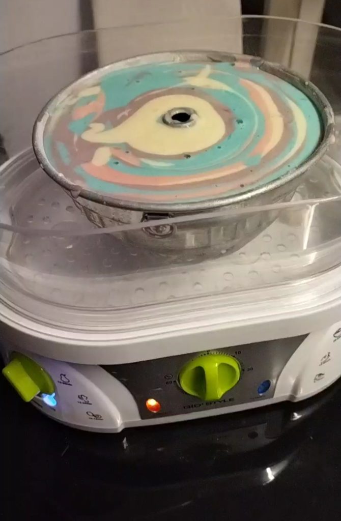 • En un molde de rosquilla de 22 cm. de diámetro untado con mantequilla y espolvoreado con harina, coloca de forma alternada la mezcla: dos cucharadas de rojo, encima en el mismo punto añade dos cucharadas de verde, encima dos de violeta y luego dos del color neutro, continúa así hasta que termines la masa. Si es demasiada, prepara muffins, cocción al vapor durante unos 20 minutos.