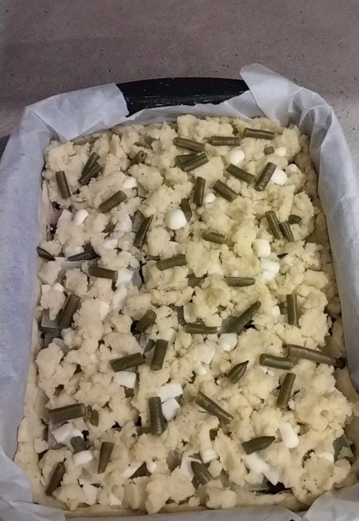 Intentad desmenuzar el resto de la mezcla de patata sobre la capa de quesos, añadid algunos trozos de judía cortados, espolvoread con 30 g de parmesano rallado y poned unas nuececitas de mantequilla.